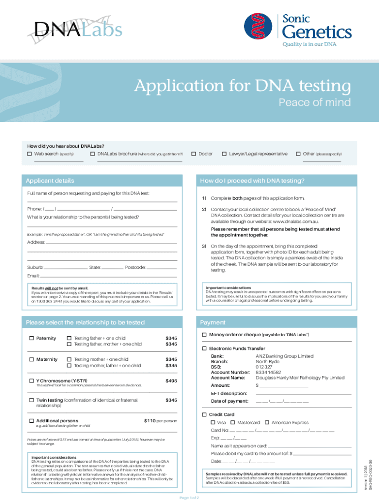 Application for DNA testing Peace of window did you hear about Deals? Web search (specify)Deals brochure (where did you get it from?) DoctorApplicant detailsLawyer/Legal representativeOther (please