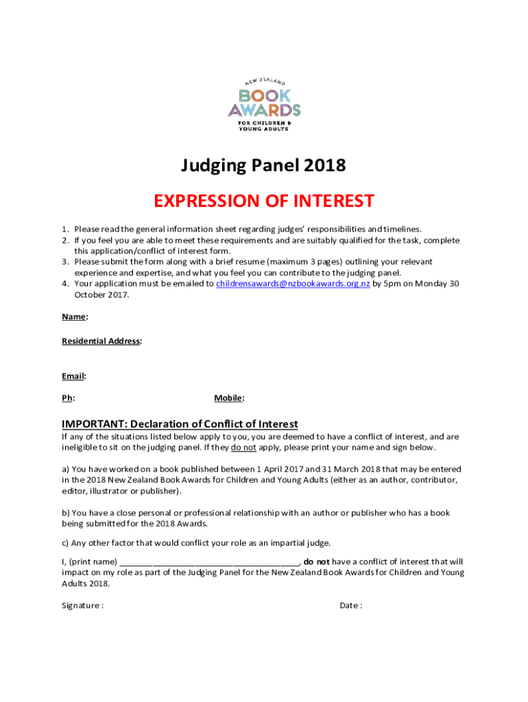 Judging Panel 2018 EXPRESSION OF INTEREST 1. Please read the general information sheet regarding judges responsibilities and timelines. 2. If you feel you are able to meet these requirements and are