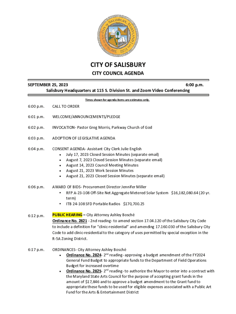 CITY OF SALISBURY CITY COUNCIL AGENDASEPTEMBER 25, 2023 6:00 p.m. Salisbury Headquarters at 115 S. Division St. and Zoom Video Conferencing Times shown for agenda items are estimates only.6:00 p.m.CALL