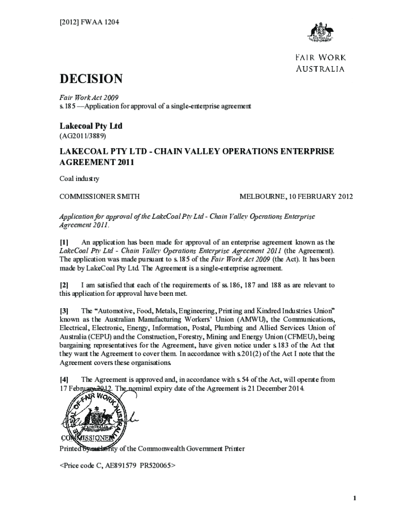 [2012] FAA 1204DECISION Fair Work Act 2009 s.185 Application for approval of a single enterprise agreementLakecoal Pty Ltd (AG2011/3889)LATERAL PTY LTD CHAIN VALLEY OPERATIONS ENTERPRISE AGREEMENT
