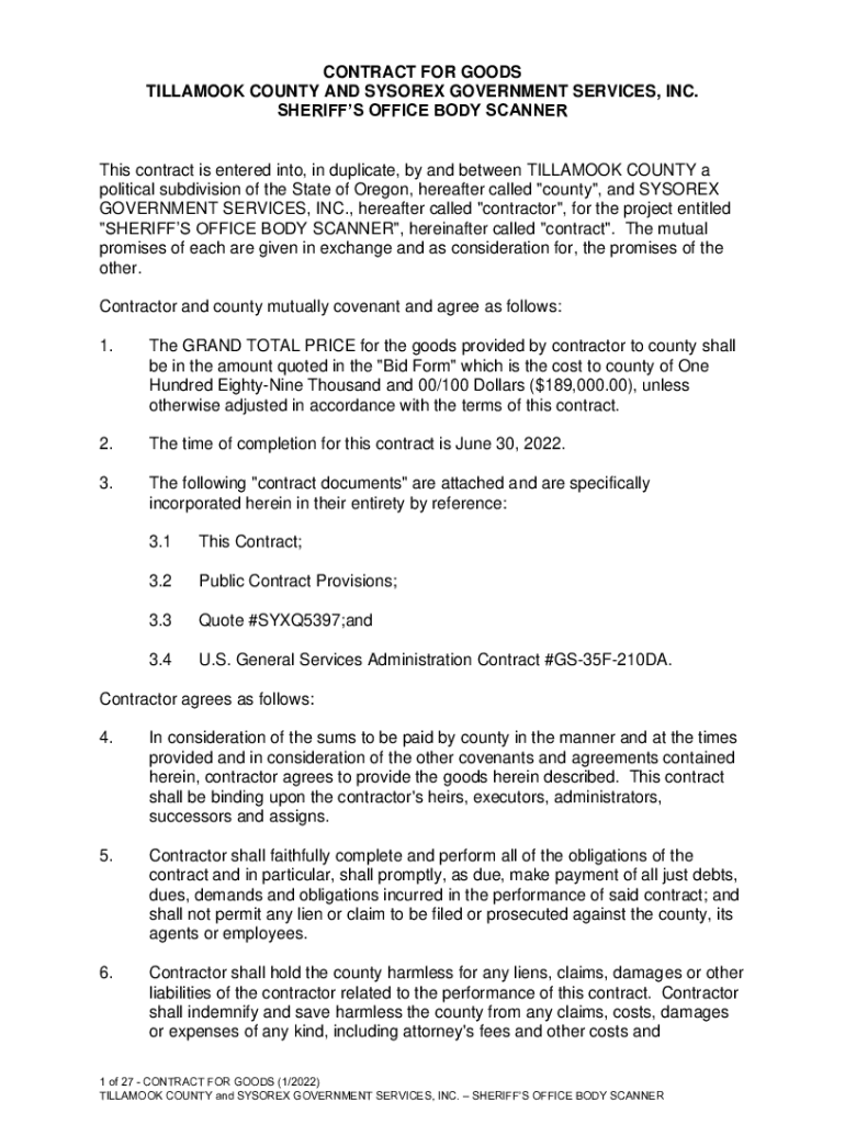 CONTRACT FOR GOODS BILLHOOK COUNTY AND MYSORE GOVERNMENT SERVICES, INC. SHERIFFS OFFICE BODY Scanners contract is entered into, in duplicate, by and between BILLHOOK COUNTY a political subdivision