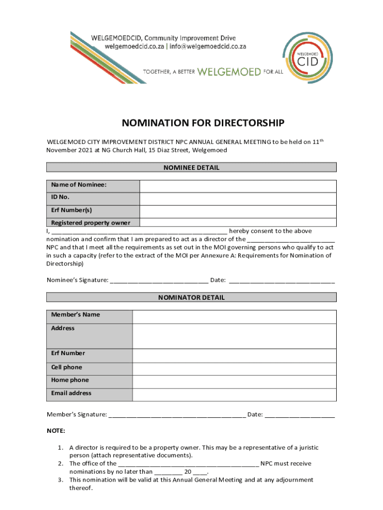 NOMINATION FOR DIRECTORSHIP WELCOMED CITY IMPROVEMENT DISTRICT NPC ANNUAL GENERAL MEETING to be held on 11th November 2021 at NG Church Hall, 15 Diaz Street, WelgemoedNOMINEE DETAIL Name of Nominee: