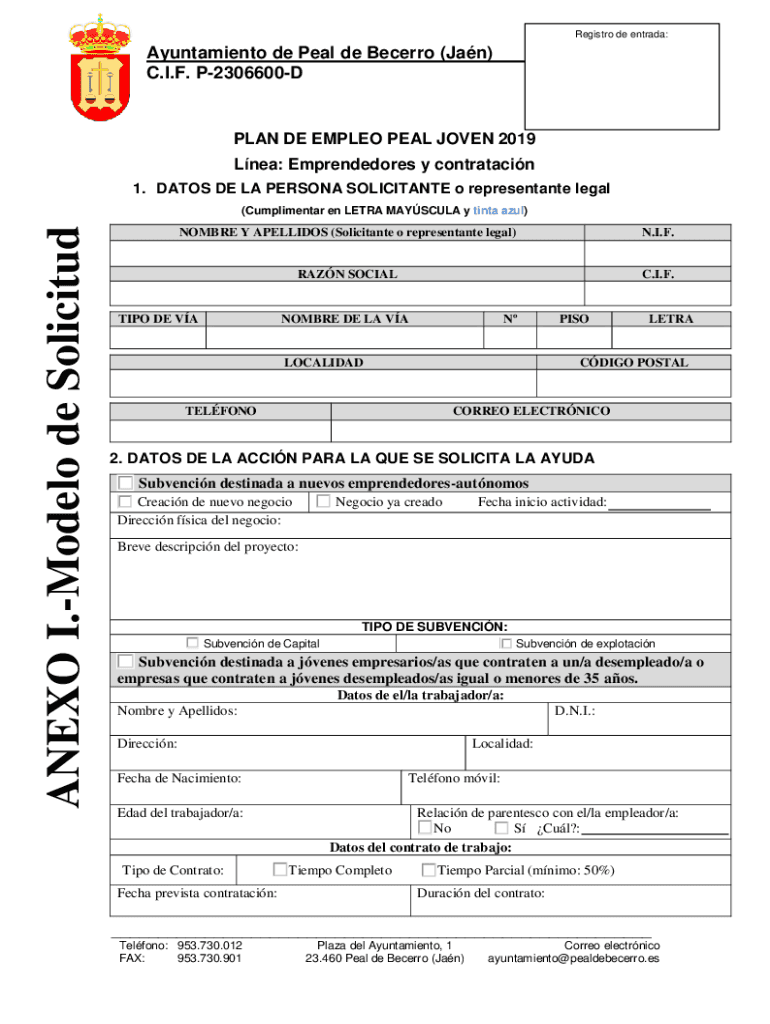 Registry de Estrada:Ayuntamiento DE Peal de Becerro (Jan) C.I.F. P2306600D RESTABLECERPLAN DE TEMPLE PEAL OVEN 2019 Lea: Emprendedores y contratacin 1. DATES DE LA PERSONA SOLICITING to represent