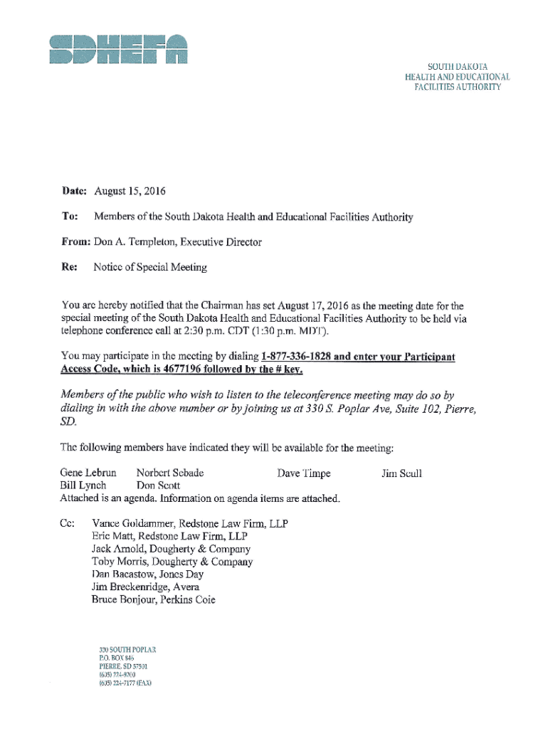 SOUTH DAKOTA HEALTH AND EDUCATIONAL FACILITIES AUTHORITY Table of Contents AUGUST 17, 2016, SPECIAL MEETING 1. Board Member Roll Call and attendance confirmation for all onboard attendees2. Minutes
