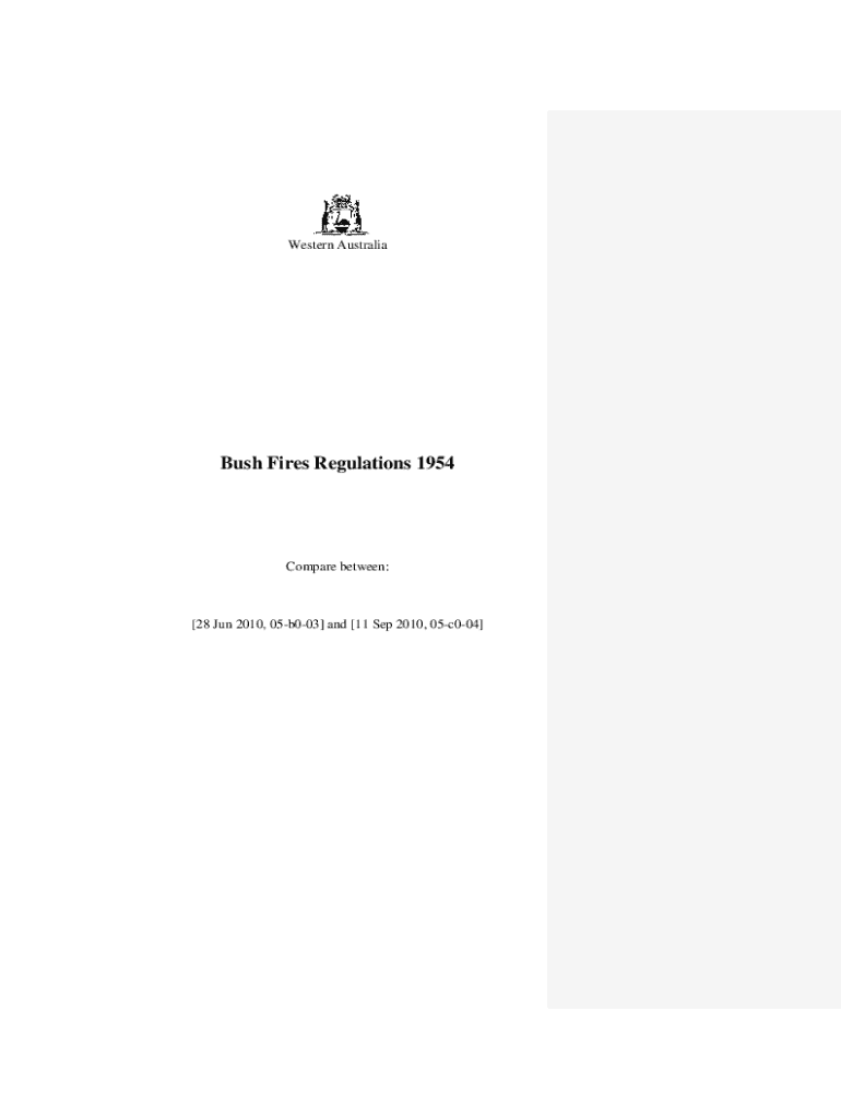Western Australia Bush Fires Regulations 1954Compare between:[28 Jun 2010, 05b003] and [11 Sep 2010, 05c004]Western Australia Bush Fires Act 1954Bush Fires Regulations 1954 Part I Preliminary 1. Citation