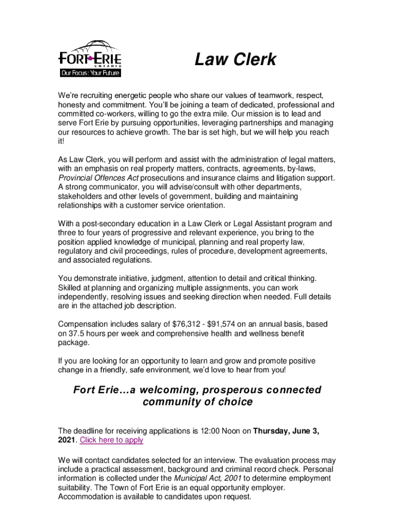 Law Clerk We're recruiting energetic people who share our values of teamwork, respect, honesty and commitment. You'll be joining a team of dedicated, professional and committed coworkers, willing