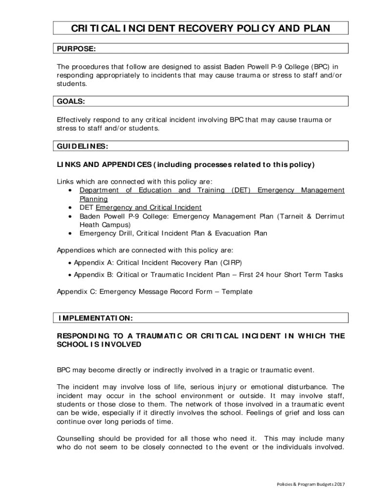 CRITICAL INCIDENT RECOVERY POLICY AND PLAN PURPOSE: The procedures that follow are designed to assist Baden Powell P9 College (BPC) in responding appropriately to incidents that may cause trauma or