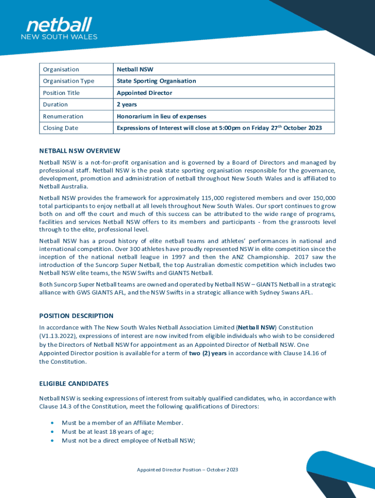 OrganisationNetball NSWOrganisation Testate Sporting OrganisationPosition TitleAppointed DirectorDuration2 yearsRenumerationHonorarium in lieu of expensesClosing DateExpressions of Interest will close