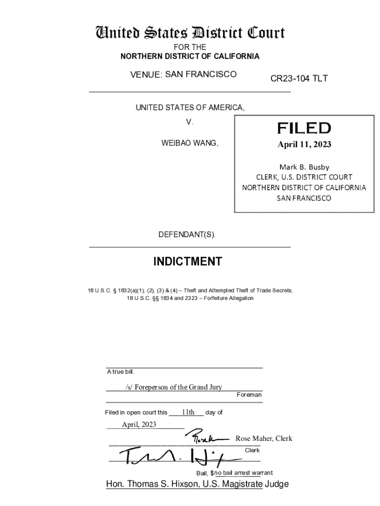 United States District Court FOR THE NORTHERN DISTRICT OF CALIFORNIAVENUE: SAN FRANCISCOCR23104 UNITED STATES OF AMERICA, FILED. WEIBO WANG, April 11, 2023, Mark B. Busby CLERK, U.S. DISTRICT COURT