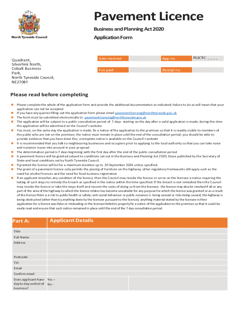 Pavement License Business and Planning Act 2020 Application FormQuadrant, Silver link North, Cobalt Business Park, North Inside Council, NE270BYDate received no. Fee paidReceipt no. PLINTH _ _ _ _Please