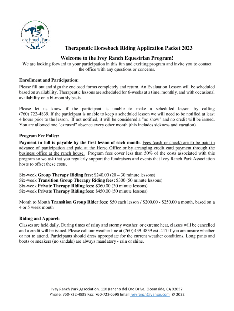 Therapeutic Horseback Riding Application Packet 2023 Welcome to the Ivey Ranch Equestrian Program! We are looking forward to your participation in this fun and exciting program and invite you to contact