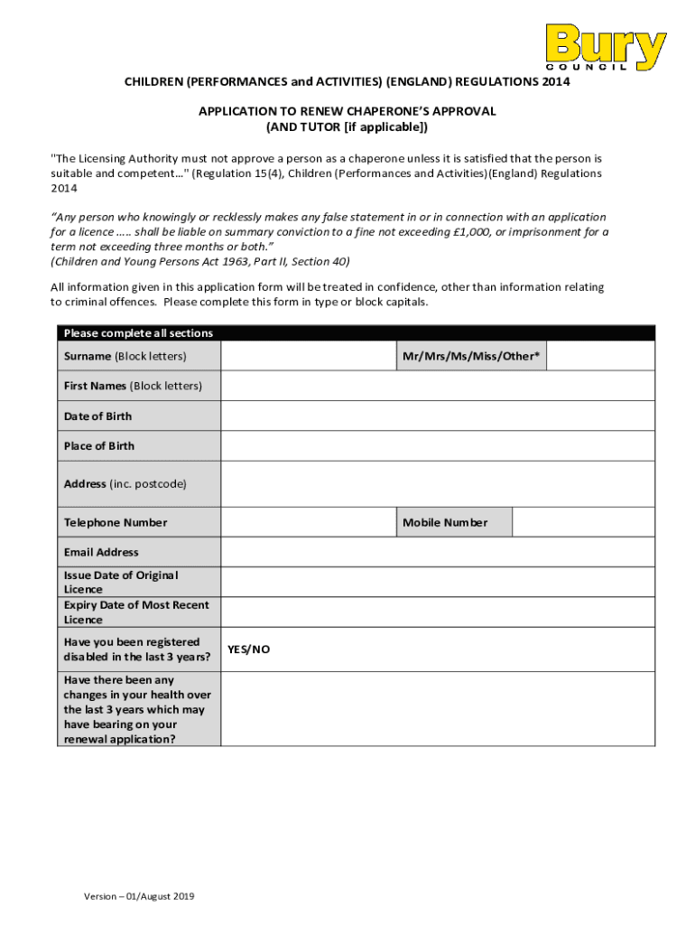 CHILDREN (PERFORMANCES and ACTIVITIES) (ENGLAND) REGULATIONS 2014 APPLICATION TO RENEW CHAPERONES APPROVAL (AND TUTOR [if applicable]) \”The Licensing Authority must not approve a person as a chaperone