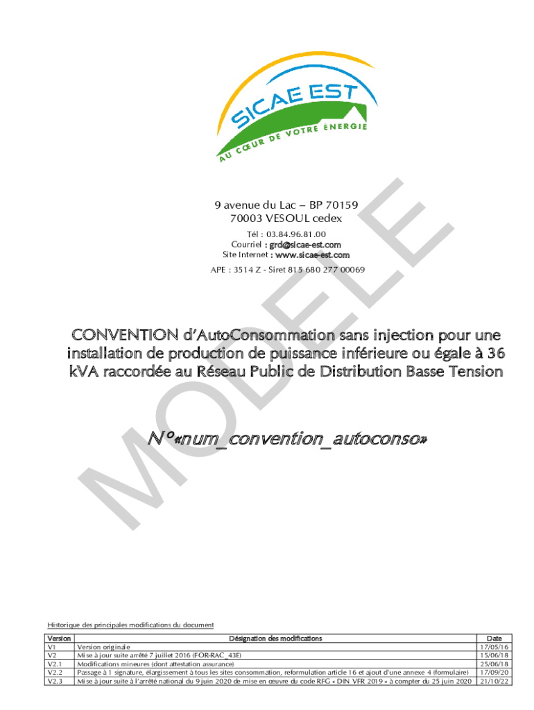 EL E9 avenue Du Lac BP 70159 70003 VES OUL CEDEX Tl : 03.84.96.81.00 Courier : grd@sicaeest.com Site Internet : www.sicaeest.comAPE : 3514 Z SIRET 815 680 277 00069ODCONVENTION dAutoConsommation sans