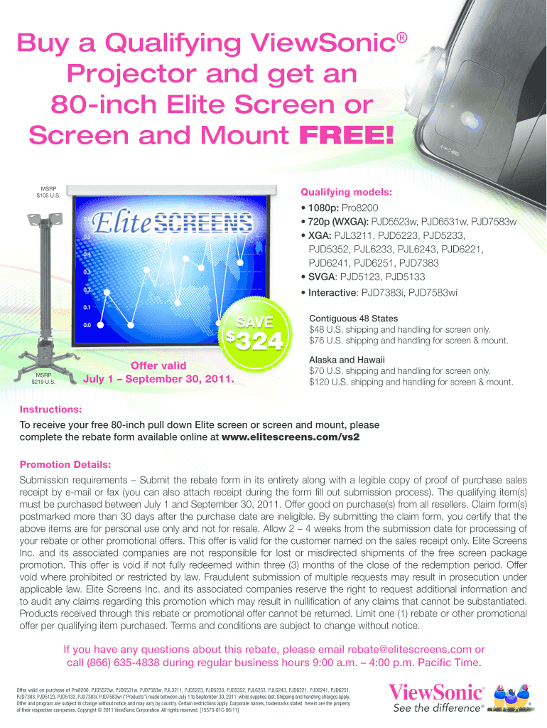 Buy a Qualifying Viewpoint Projector and get an 80-inch Elite Screen or Screen and Mount FREE! MSRP $105 U.S. Qualifying models: 1080p: Pro8200 720p (WGA): PJD5523w, PJD6531w, PJD7583w LGA: PJL3211,