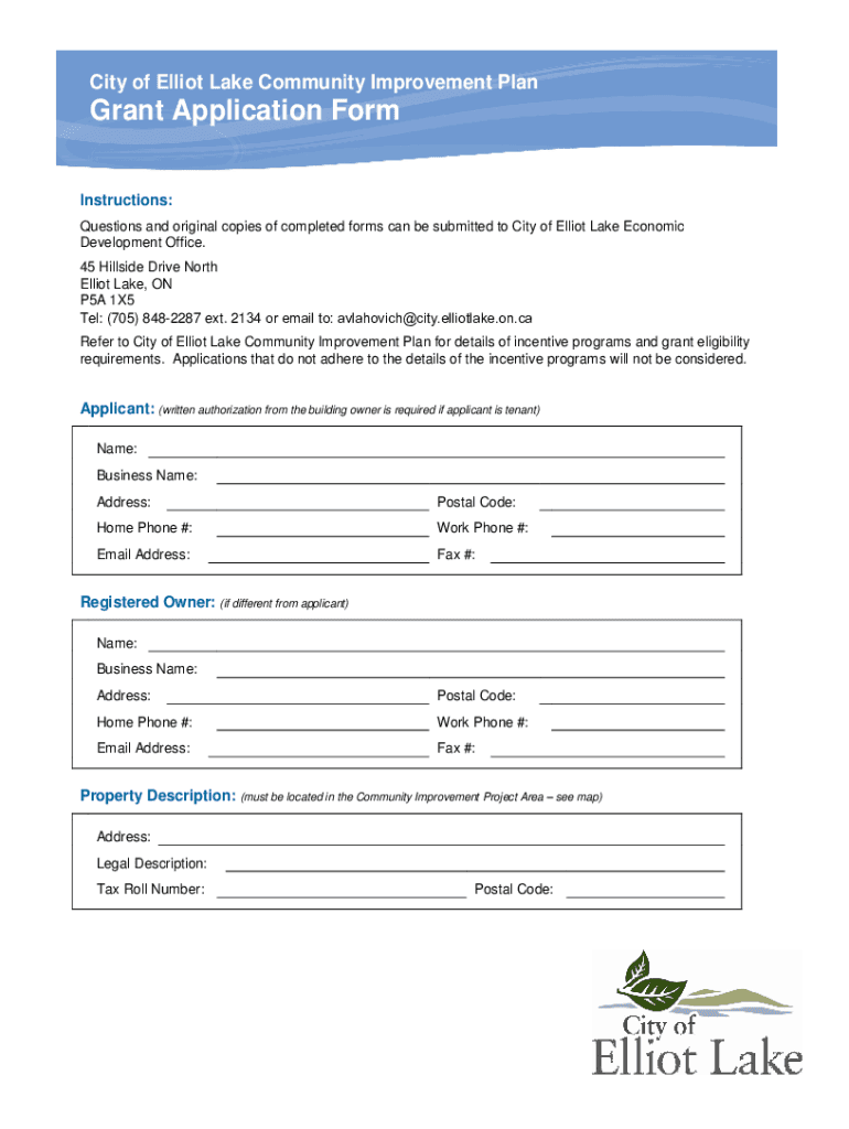 City of Elliot Lake Community Improvement Plan Grant Application Form Instructions: Questions and original copies of completed forms can be submitted to City of Elliot Lake Economic Development Office.