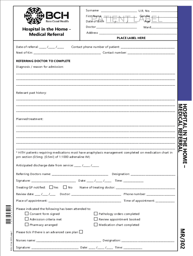 Surname. R. No. First Name Date of Birth/Age/DoctorHospital in the Home Medical Referral Date of referral: ___ /___ /___Gender Readdress PLACE LABEL Recontact phone number of patient: ___Next of Kin: