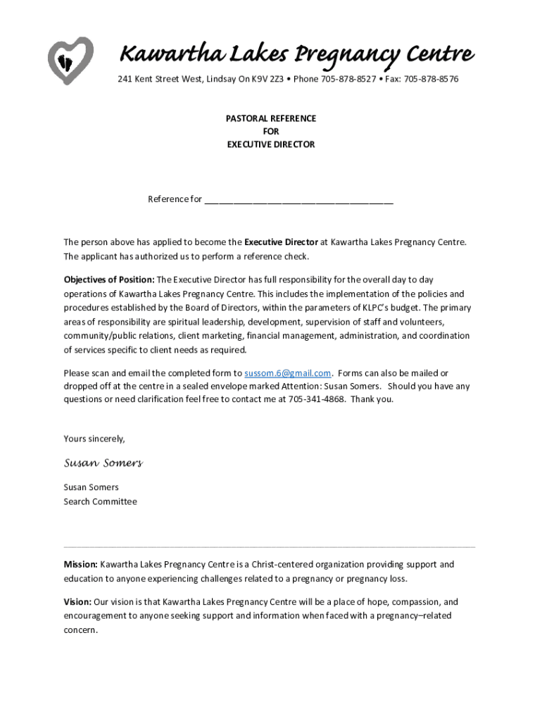 Kawartha Lakes Pregnancy Center 241 Kent Street West, Lindsay On K9V 2Z3 Phone 7058788527 Fax: 7058788576PASTORAL REFERENCE FOR EXECUTIVE DIRECTORReference for ___The person above has applied to become