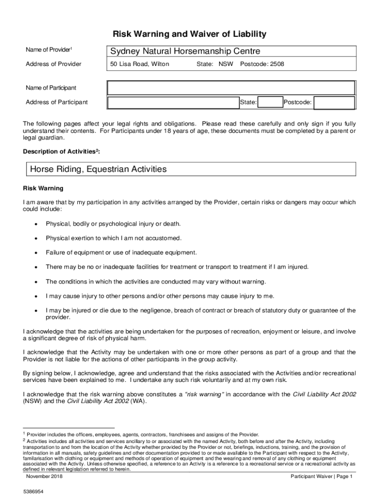 Anyone who plans to participate in an equestrian event, such as a competition, clinic, or trail ride, will need to fill out an equestrian events release form.