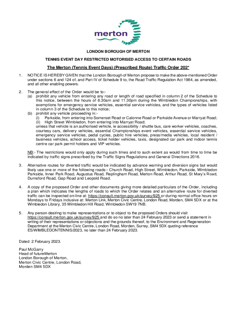 ., Y\', .,.,.,,,,. Merton :::. . . __,,,., .........,, # LONDON BOROUGH OF MERTON TENNIS EVENT DAY RESTRICTED Motorized ACCESS TO CERTAIN Roadside Merton (Tennis Event Days) (Prescribed Route) Traffic