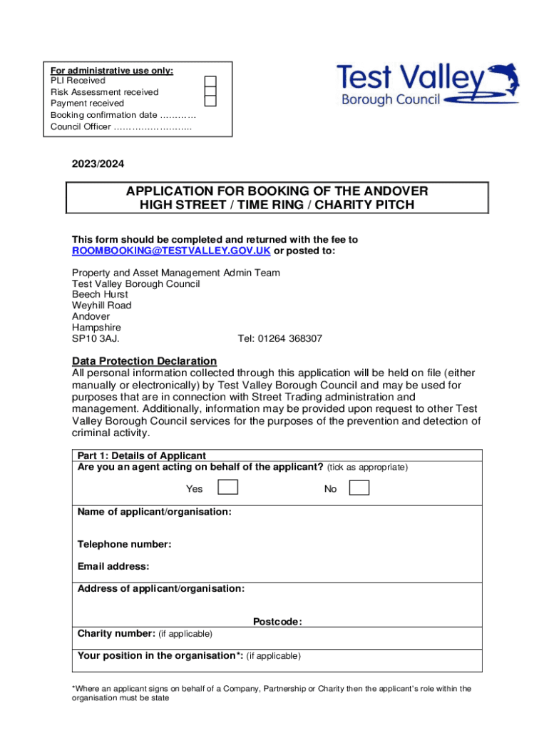 For administrative use only: PCI Received Risk Assessment received Payment received Booking confirmation date Council Officer .2023/2024APPLICATION FOR BOOKING OF THE ANDOVER HIGH STREET / TIME RING