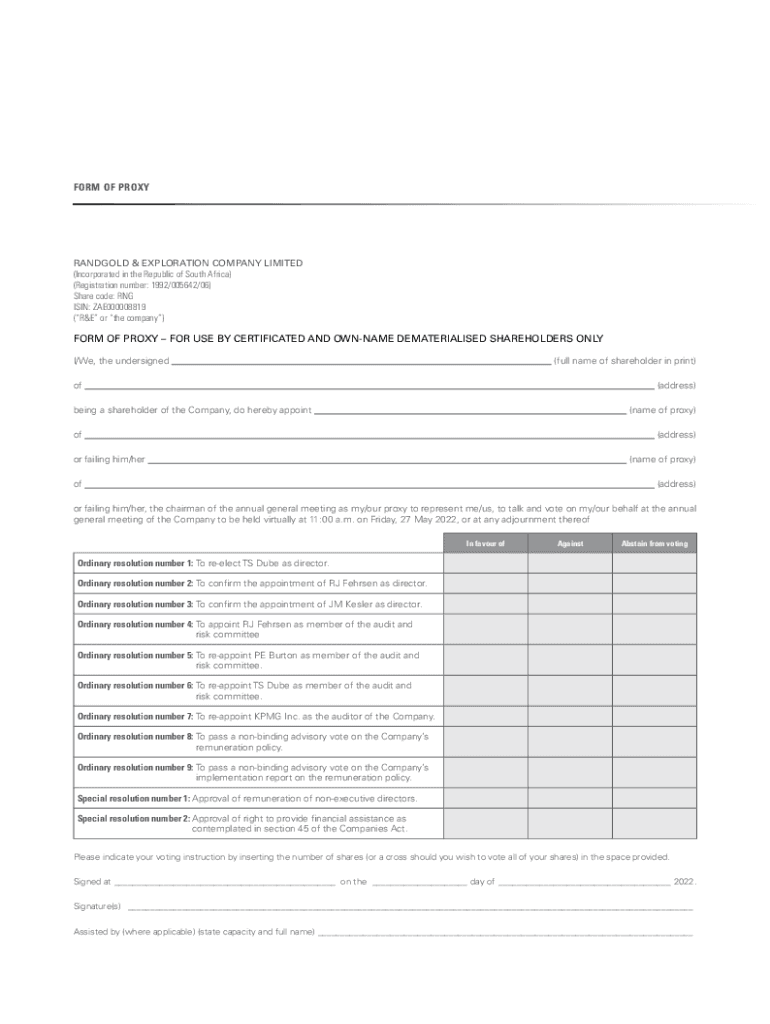 FORM OF PROXYRANDGOLD & EXPLORATION COMPANY LIMITED (Incorporated in the Republic of South Africa) (Registration number: 1992/005642/06) Share code: RNG ISIN: ZAE000008819 (R&E or the company)FORM
