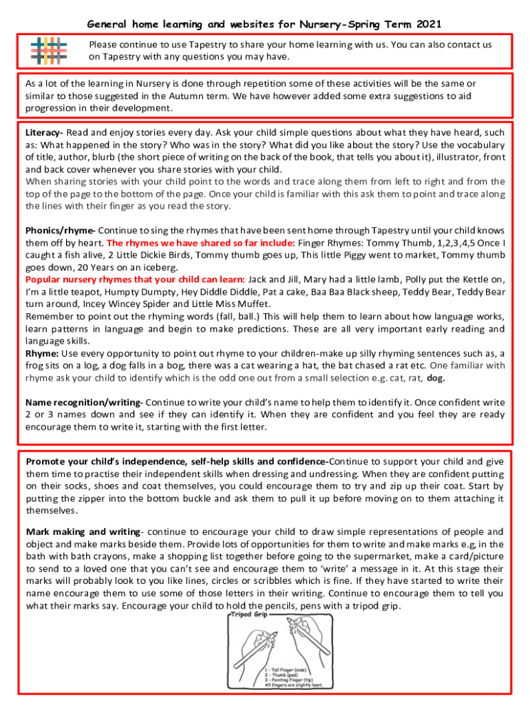 General home learning and websites for NurserySpring Term 2021 Please continue to use Tapestry to share your home learning with us. You can also contact us on Tapestry with any questions you may have.