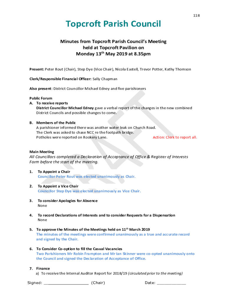 118Topcroft Parish Council Minutes from Top croft Parish Councils Meeting held at Top croft Pavilion on Monday 13th May 2019 at 8.35pm Present: Peter Rout (Chair), Step Dye (Vice Chair), Nicola East
