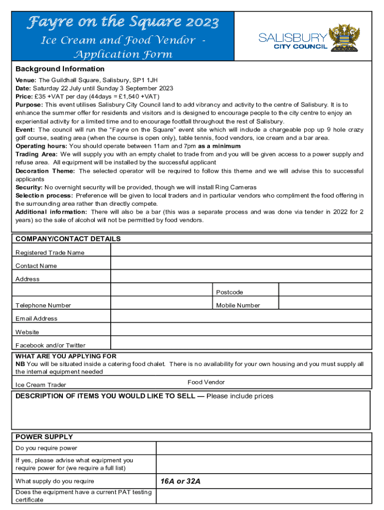 Fare on the Square 2023 Ice Cream and Food Vendor Application Form Background Information Venue: The Guildhall Square, Salisbury, SP1 1JH Date: Saturday 22 July until Sunday 3 September 2023 Price: