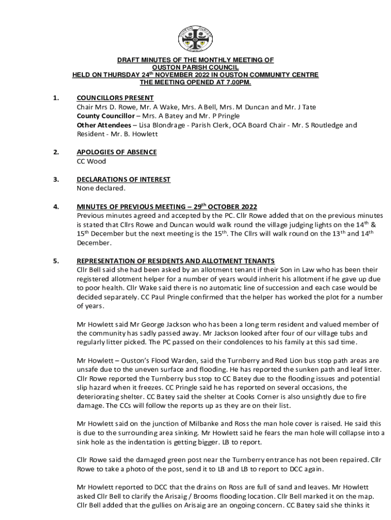 DRAFT MINUTES OF THE MONTHLY MEETING OF HOUSTON PARISH COUNCIL HELD ON THURSDAY 24th NOVEMBER 2022 IN HOUSTON COMMUNITY Center THE MEETING OPENED AT 7.00PM.1.COUNCILLORS PRESENT Chair Mrs D. Rowe,