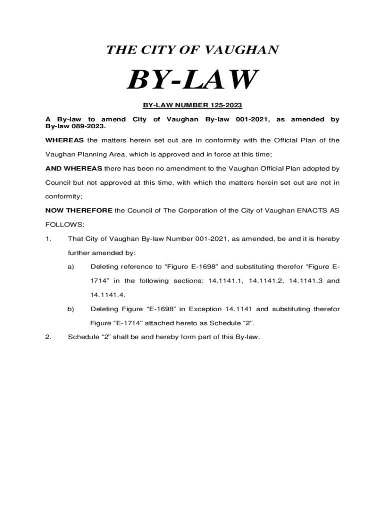 THE CITY OF VAUGHANBYLAW BYLAW NUMBER 1252023 A Bylaw to amend City of Vaughan Bylaw 0012021, as amended by Bylaw 0892023. WHEREAS the matters herein set out are in conformity with the Official Plan