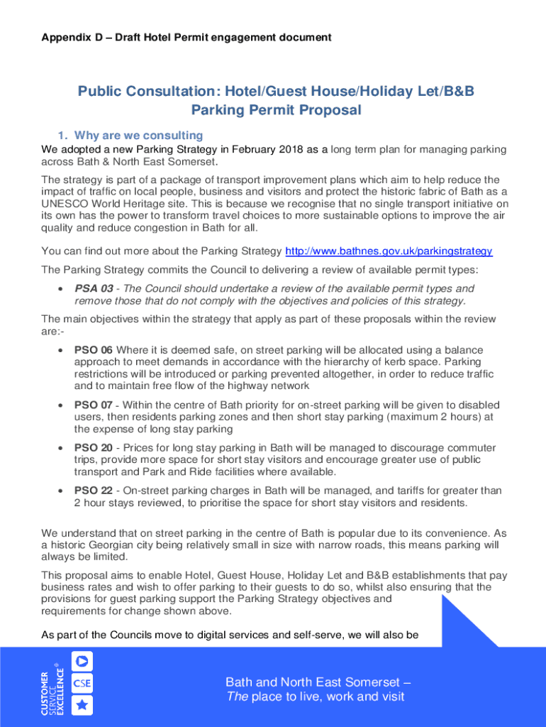 Appendix D Draft Hotel Permit engagement documentPublic Consultation: Hotel/Guest House/Holiday Let/B&B Parking Permit Proposal 1. Why are we consulting We adopted a new Parking Strategy in February