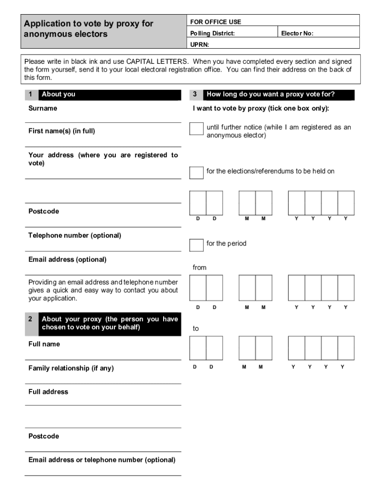 Application to vote by proxy for anonymous electors OFFICE USE Polling District:Elector No:UPON:Please write in black ink and use CAPITAL LETTERS. When you have completed every section and signed