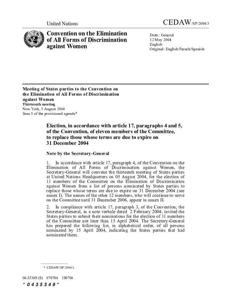 United NationsConvention on the Elimination of All Forms of Discrimination against WomenCEDAW/SP/2004/3 Dist.: General 12 May 2004 English Original: English/French/SpanishMeeting of States parties