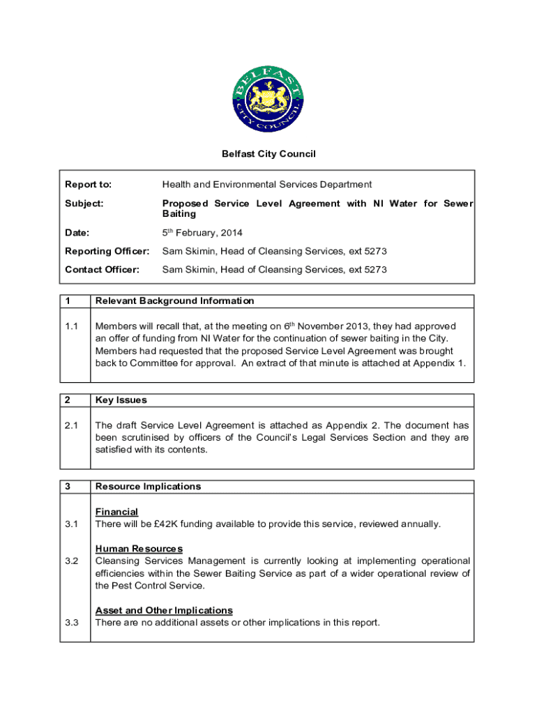 Report to:Health and Environmental Services DepartmentSubject:Proposed Service Level Agreement with NI Water for Sewer