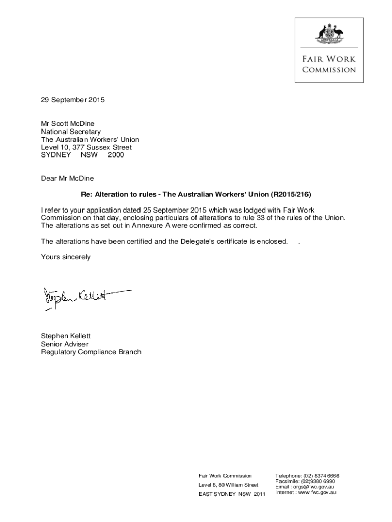 29 September 2015Mr Scott Machine National Secretary The Australian Workers Union Level 10, 377 Sussex Street SYDNEY NSW 2000Dear Mr Machine Re: Alteration to rules The Australian Workers Union (R2015/216)
