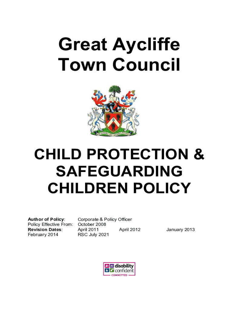 Great Wycliffe Town CouncilCHILD PROTECTION & SAFEGUARDING CHILDREN POLICY Author of Policy: Policy Effective From: Revision Dates: February 2014Corporate & Policy Officer October 2008 April 2011