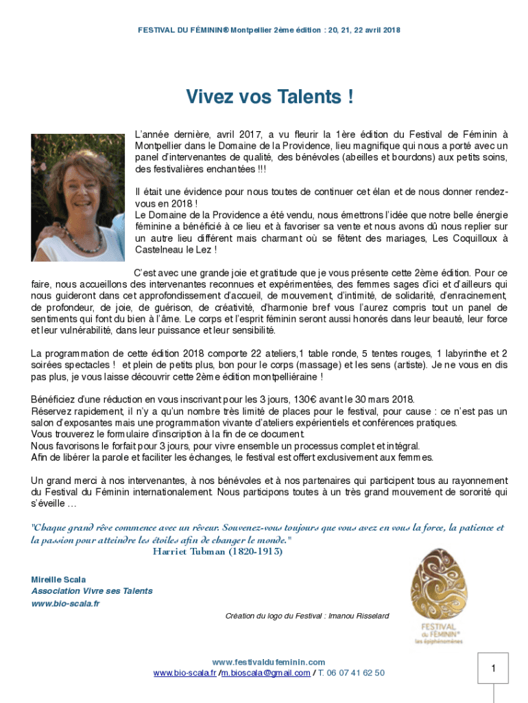 Le festival du féminin doit être rempli en fournissant des informations sur l'événement, les intervenants, le public cible et les objectifs.