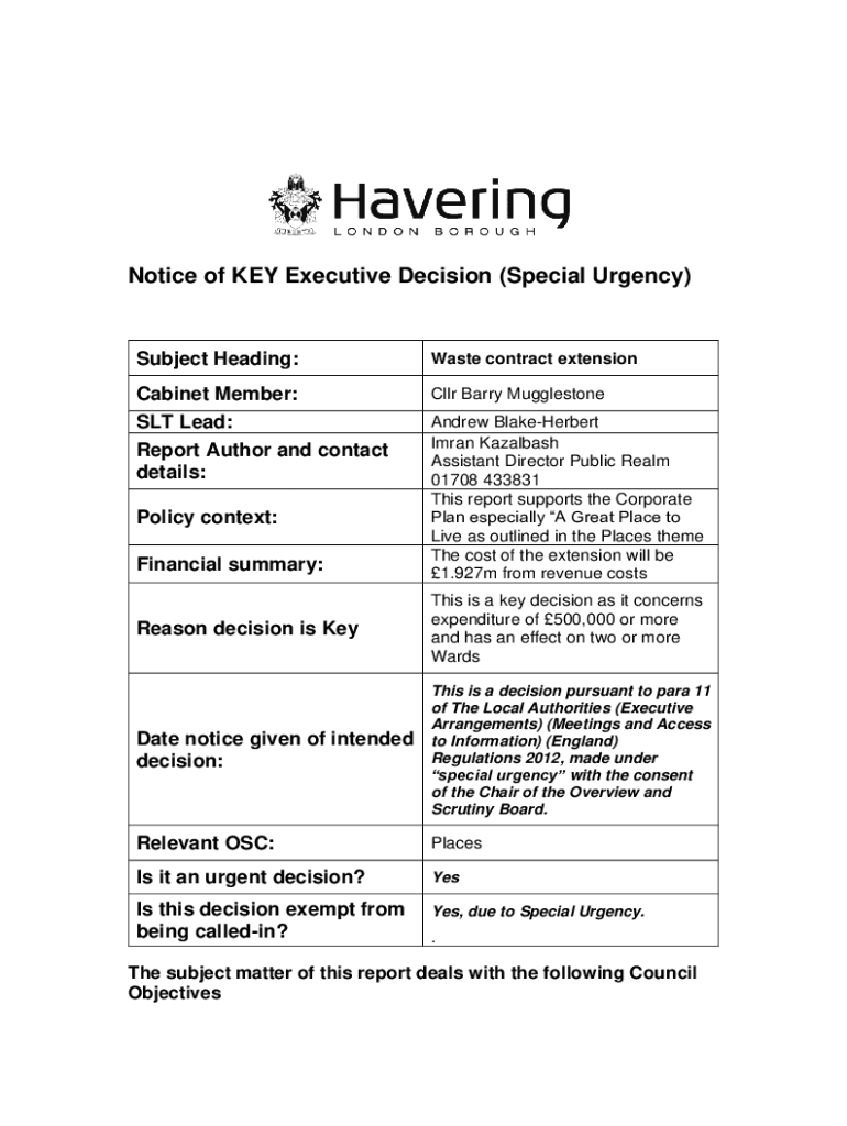 Notice of KEY Executive Decision (Special Urgency)Subject Heading:Waste contract extensionCabinet Member:CLR Barry MugglestoneSLT Lead: Report Author and contact details:Andrew Blake Herbert Imran