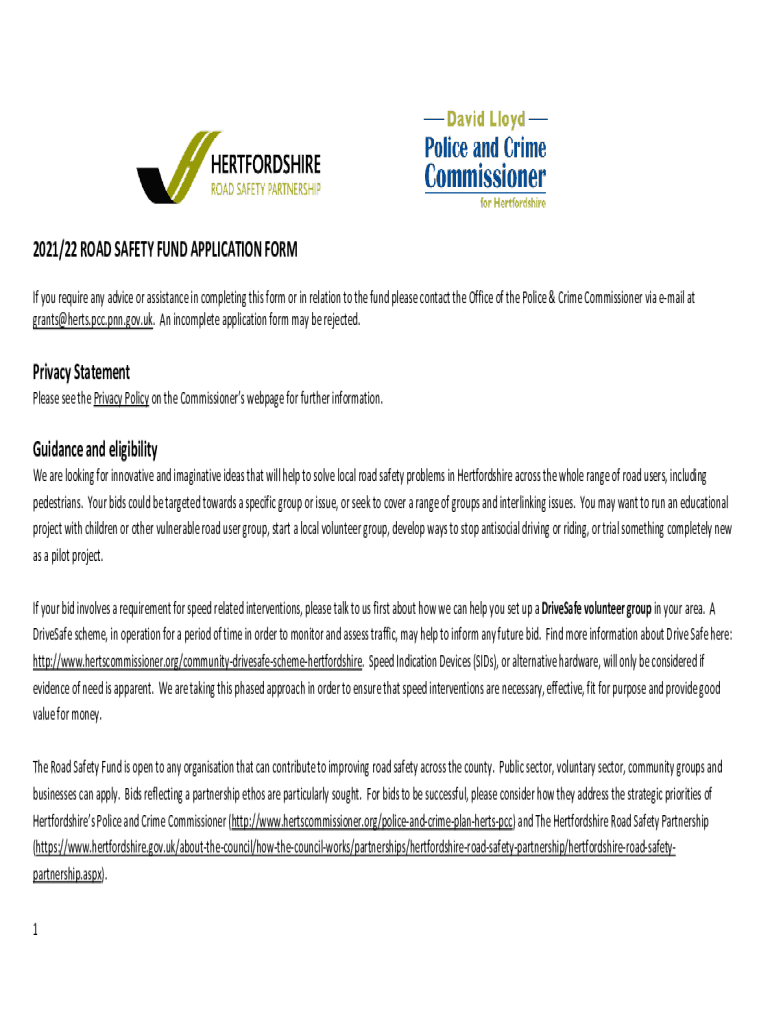 2021/22 ROAD SAFETY FUND APPLICATION FORM If you require any advice or assistance in completing this form or in relation to the fund please contact the Office of the Police & Crime Commissioner via