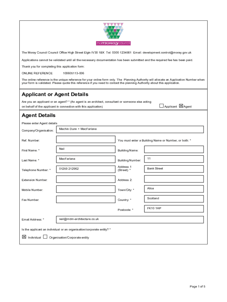 The Moray Council Office High Street Elgin IV30 1BX Tel: 0300 1234561 Email: development.control@moray.gov.uk Applications cannot be validated until all the necessary documentation has been submitted