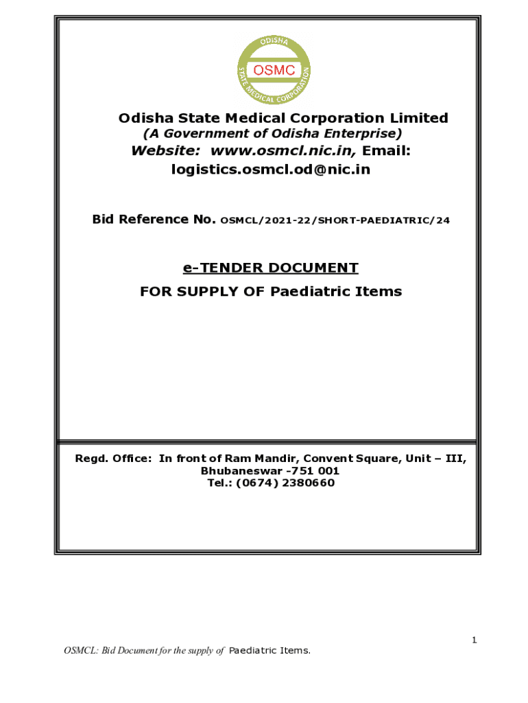 Odisha State Medical Corporation Limited (A Government of Odisha Enterprise)Website: www.osmcl.nic.in, Email: logistics.osmcl.od@nic.inBid Reference No.OSMCL/202122/SHORTPAEDIATRIC/24eTENDER DOCUMENT