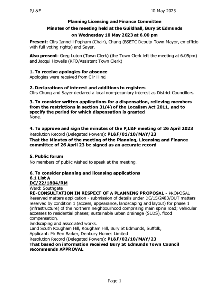 P,L&F10 May 2023 Planning Licensing and Finance Committee Minutes of the meeting held at the Guildhall, Bury St Edmund son Wednesday 10 May 2023 at 6.00 present: Class IannelliPopham (Chair), Chung