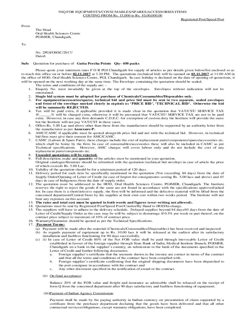 IQ FOR EQUIPMENTS/CONSUMABLES/SPARES/ACCESSORIES ITEMS COSTING FROM Rs. 15,000 to Rs. 10,00,000.00 Registered Post/Speed Post From The Head Oral Health Sciences Center PRIMER, Chandigarh. To No. 2PGI/OHS/2017/