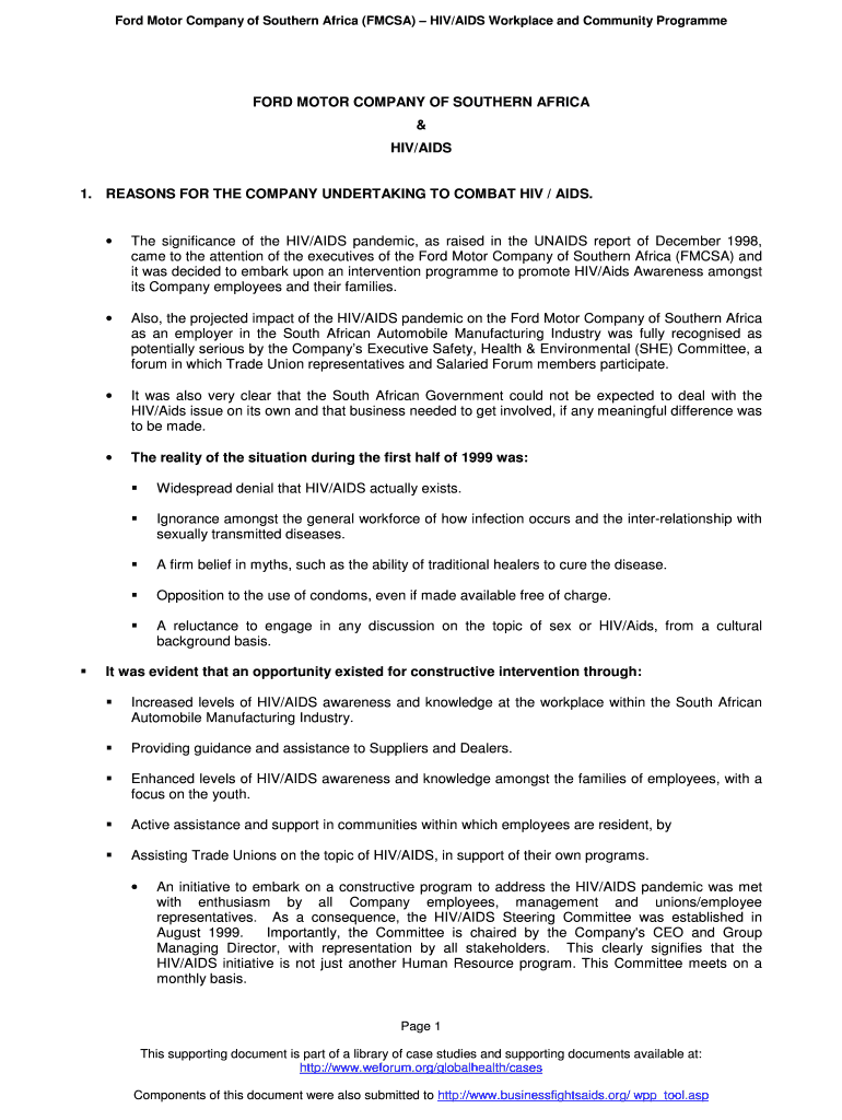 Ford Motor Company of Southern Africa (FMCSA) HIV/AIDS Workplace and Community Program FORD MOTOR COMPANY OF SOUTHERN AFRICA & HIV/AIDS 1. REASONS FOR THE COMPANY UNDERTAKING TO COMBAT HIV / AIDS.