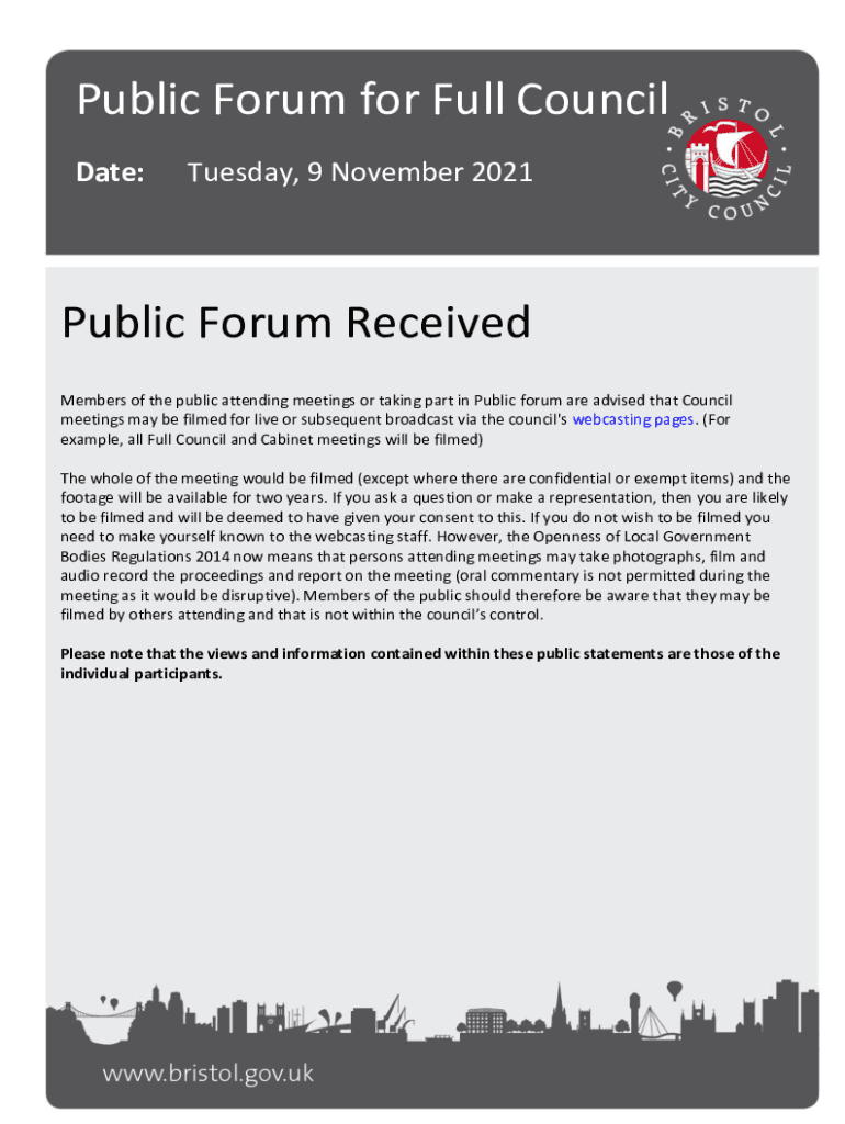 Public Forum for Full Council Date:Tuesday, 9 November 2021Public Forum Received Members of the public attending meetings or taking part in Public forum are advised that Council meetings may be filmed