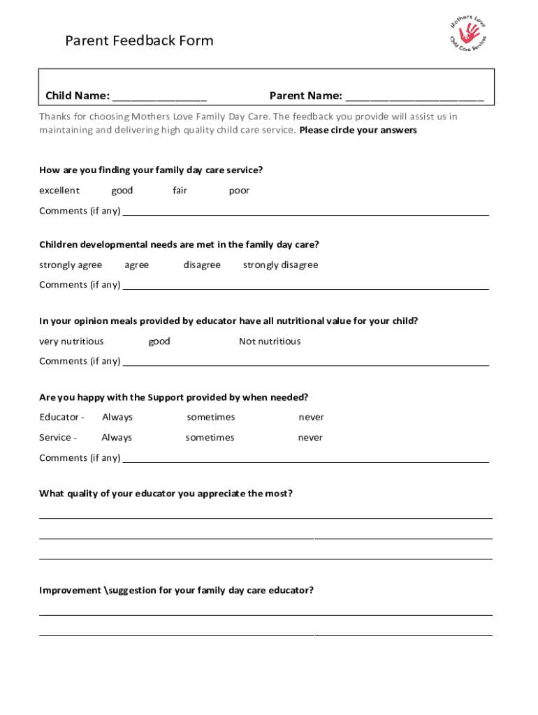 Parent Feedback Orchid Name: ___Parent Name: ___Thanks for choosing Mothers Love Family Day Care. The feedback you provide will assist us in