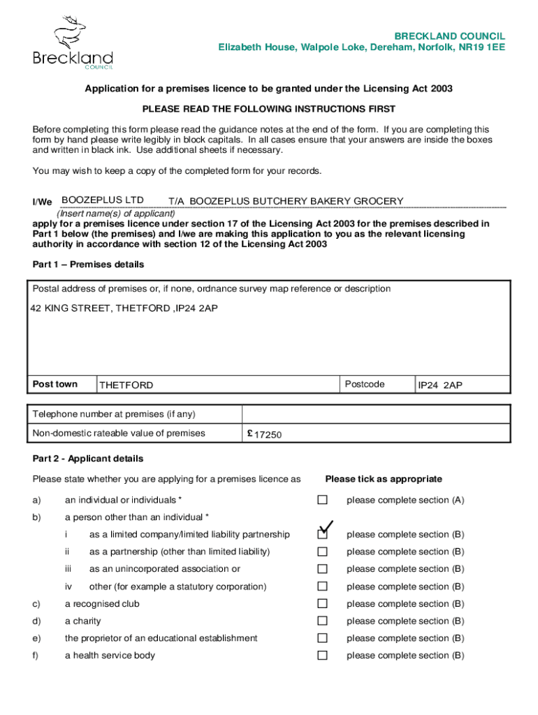 ROCKLAND COUNCIL Elizabeth House, Walpole Like, Dream, Norfolk, NR19 1EEApplication for a premises license to be granted under the Licensing Act 2003 PLEASE READ THE FOLLOWING INSTRUCTIONS FIRST Before