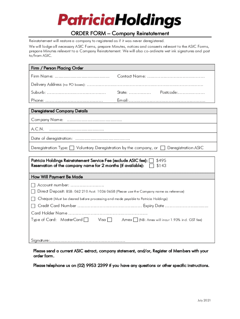 ORDER FORM Company Reinstatement will restore a company to registered as if it was never deregistered. We will lodge all necessary ASIC Forms, prepare Minutes, notices and consents relevant to the