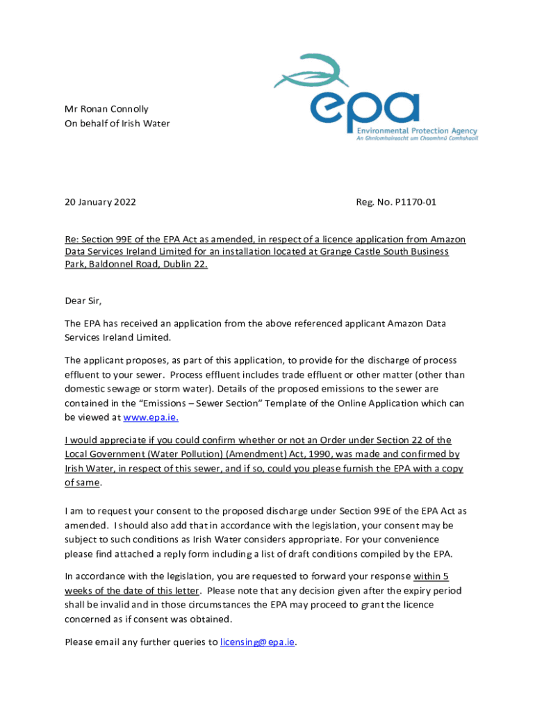 Mr Roman Connolly On behalf of Irish Water20 January 2022Reg. No. P117001Re: Section 99E of the EPA Act as amended, in respect of a license application from Amazon Data Services Ireland Limited for