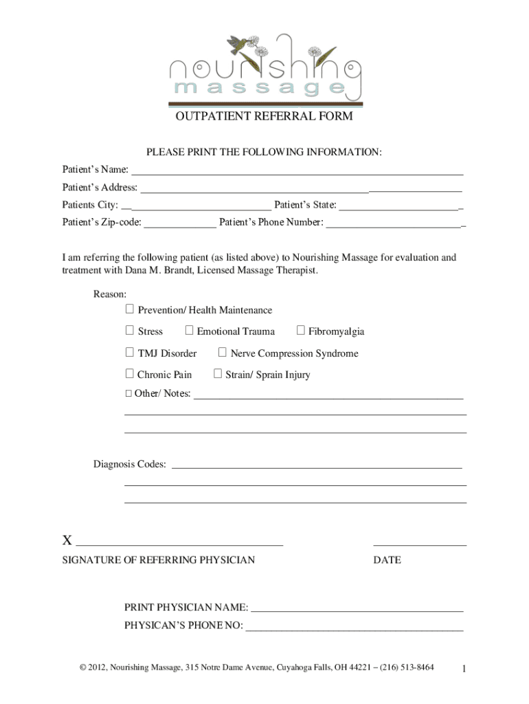 OUTPATIENT REFERRAL FORM PLEASE PRINT THE FOLLOWING INFORMATION: Patients Name: ___ Patients Address: ___ Patients City: ___ Patients State: ___ Patients Zip code: ___ Patients Phone Number: ___ I